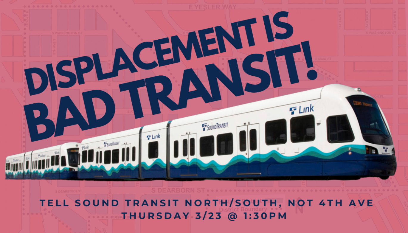 After a year of community push back, Sound Transit has introduced station location options North and South of the CID. These options would lessen the negative impacts while still providing transit to the neighborhood. On March 23, 2023, the Sound Transit board voted to continue studying North/South as the preferred alternative. The final vote depends on the outcomes of their study and continued community support of the North/South option.